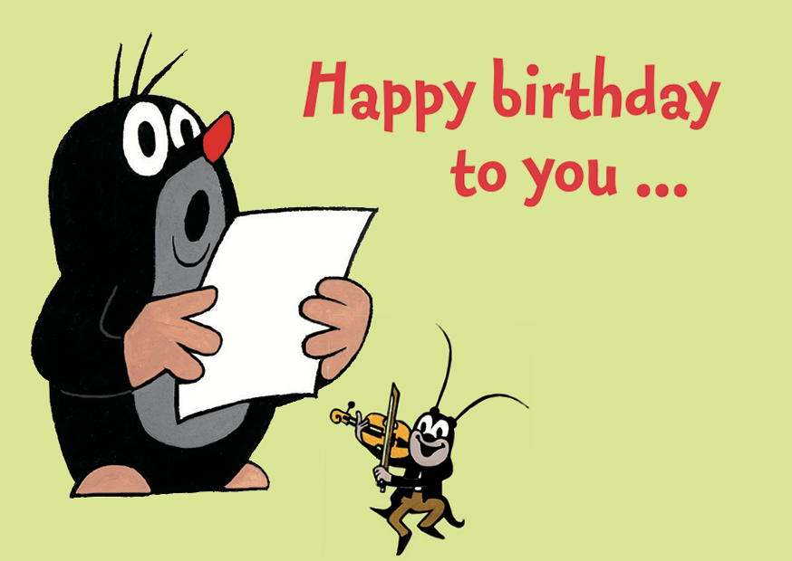 Der Maulwurf hält eine Karte in den Händen und wird von einem kleinen Insektenmusiker begleitet, der Geige spielt. Ein bunter, festlicher Moment.