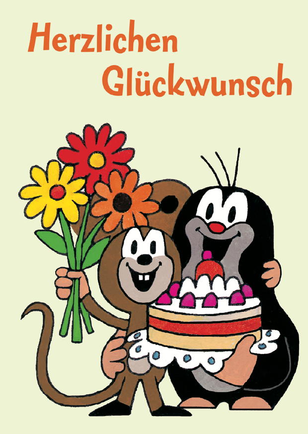 Der Maulwurf und sein Freund, das Mäuschen, stehen zusammen und halten einen bunten Blumenstrauß sowie eine Geburtstagstorte in der Hand, um eine Feier zu markieren.