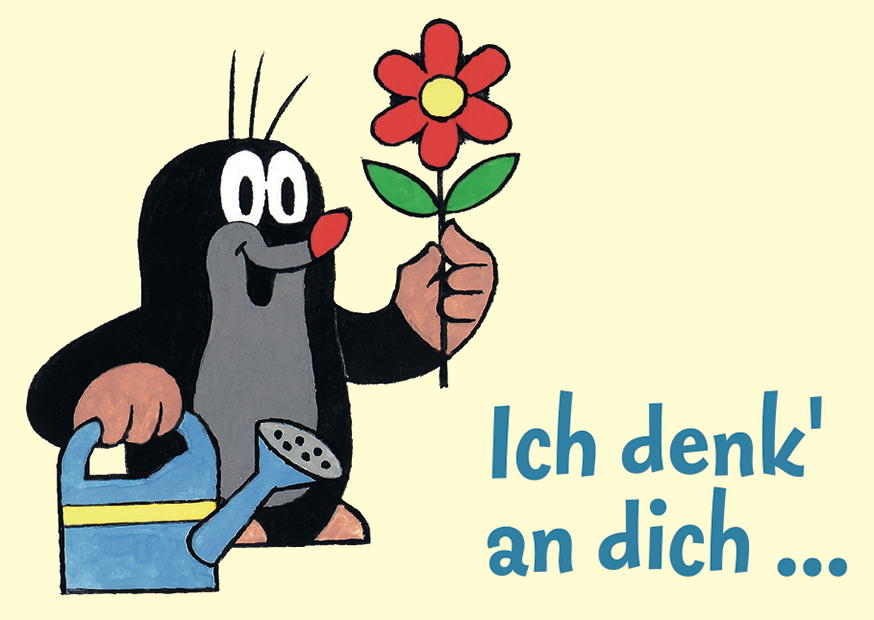 Der Maulwurf hält eine Blume in der Hand und lächelt, während er mit einer Gießkanne Wasser gibt. Er denkt an jemand Besonderen.