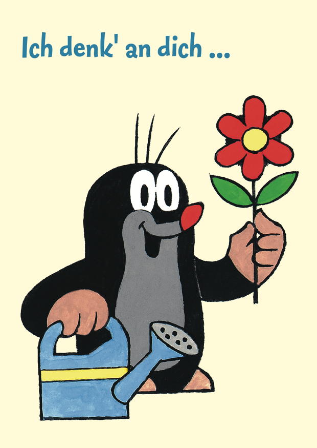 Der Maulwurf steht lächelnd da, während er eine Blume in der einen Hand und eine Gießkanne in der anderen hält. Es ist eine liebevolle, bunte Illustration.