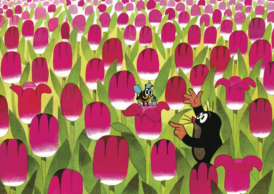 Der Maulwurf zeigt der Biene eine blühende Tulpe in einem lebhaften Feld voller pinkfarbener Blumen, das die Schönheit des Frühlings verkörpert.