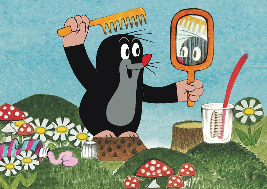 Der kleine Maulwurf steht freudig auf einer Blumenwiese, während er mit einem Kamm sein Fell frisiert und in einen Handspiegel schaut. Um ihn herum blühen bunte Blumen und Pilze.