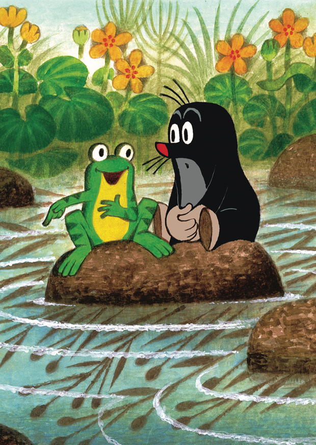 Der Maulwurf und der Frosch unterhalten sich fröhlich auf einem Stein im Teich, während rundum bunte Pflanzen und Wasser um sie sprudeln.