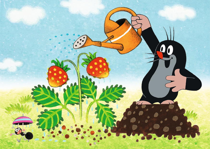 Ein Maulwurf gießt mit einer Gießkanne frisch gepflanzte Erdbeeren in einem idyllischen Garten. Es ist ein sonniger Tag, und die Pflanzen sind gut genährt.