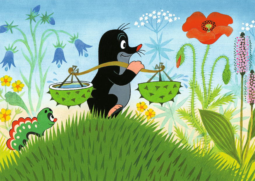 Der Maulwurf sammelt fröhlich Blumen in einer blühenden Wiese und wird von einem kleinen, freundlichen Schmetterling begleitet. Die Sonne scheint hell.