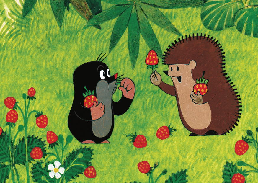 Im bunten Wald freuen sich der Maulwurf und der Igel, während sie frische Erdbeeren pflücken. Die Sonne scheint, und die Wiese blüht voller Farben.