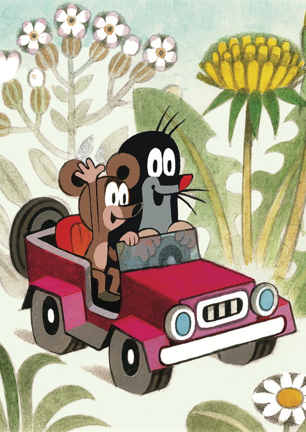 Der Maulwurf und seine Maus sitzen in einem roten Auto und genießen eine fröhliche Fahrt durch eine farbenfrohe Wiese voller Blumen bei strahlendem Sonnenschein.