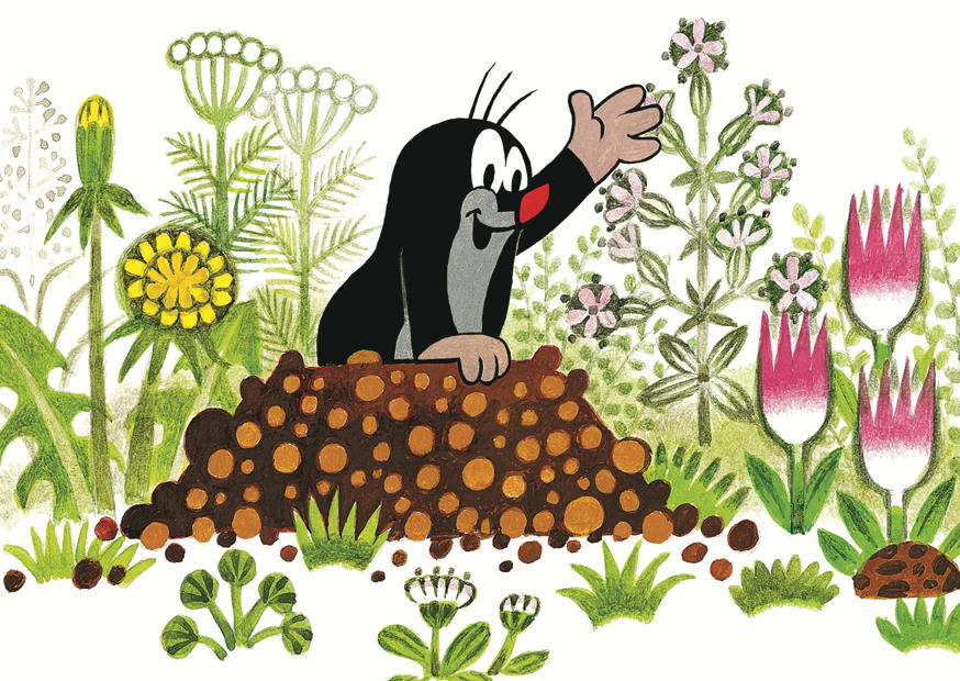 Ein Maulwurf sitzt glücklich auf einem Erdhügel und präsentiert seine Umgebung voller Frühlingsblumen und Pflanzen. Es ist ein sonniger Tag und die Farben blühen.