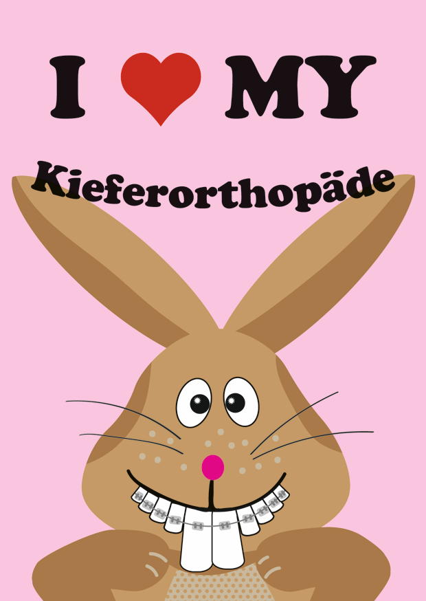 Ein lustiger Hase mit großen Ohren und einer Zahnspange lächelt stolz, während er seine Zuneigung zu Kieferorthopäden auf einem rosa Hintergrund präsentiert.
