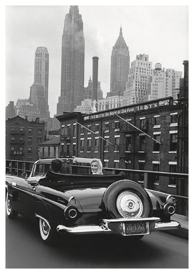 Das Bild zeigt ein elegantes, klassisches Auto auf einer Straßenauffahrt in New York. Im Hintergrund ragen beeindruckende Wolkenkratzer in den Himmel.