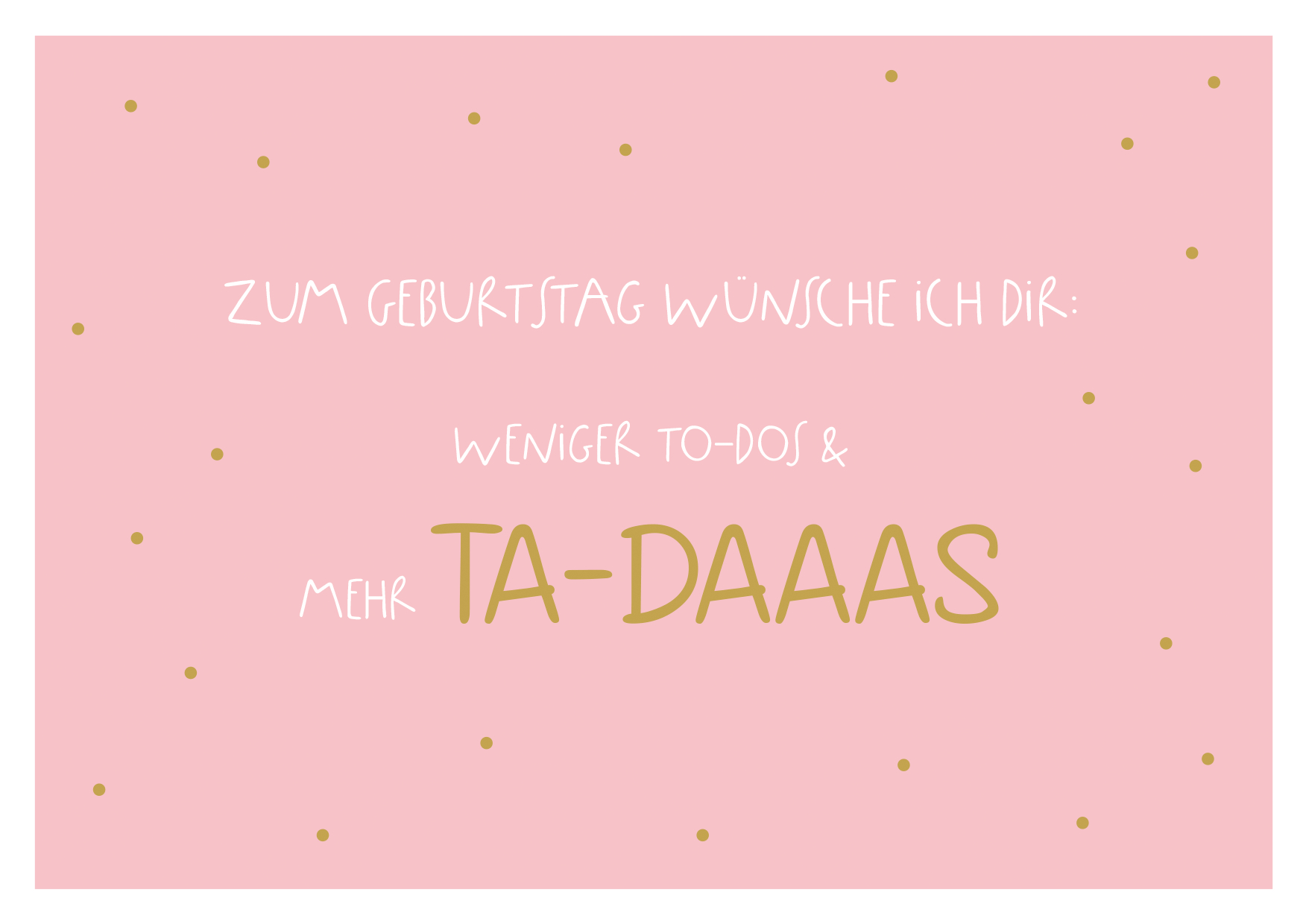 Eine fröhliche Geburtstagskarte in Rosa, dekoriert mit goldenen Punkten. Der Text wünscht weniger To-Dos und mehr Freude, ideal für einen besonderen Anlass.