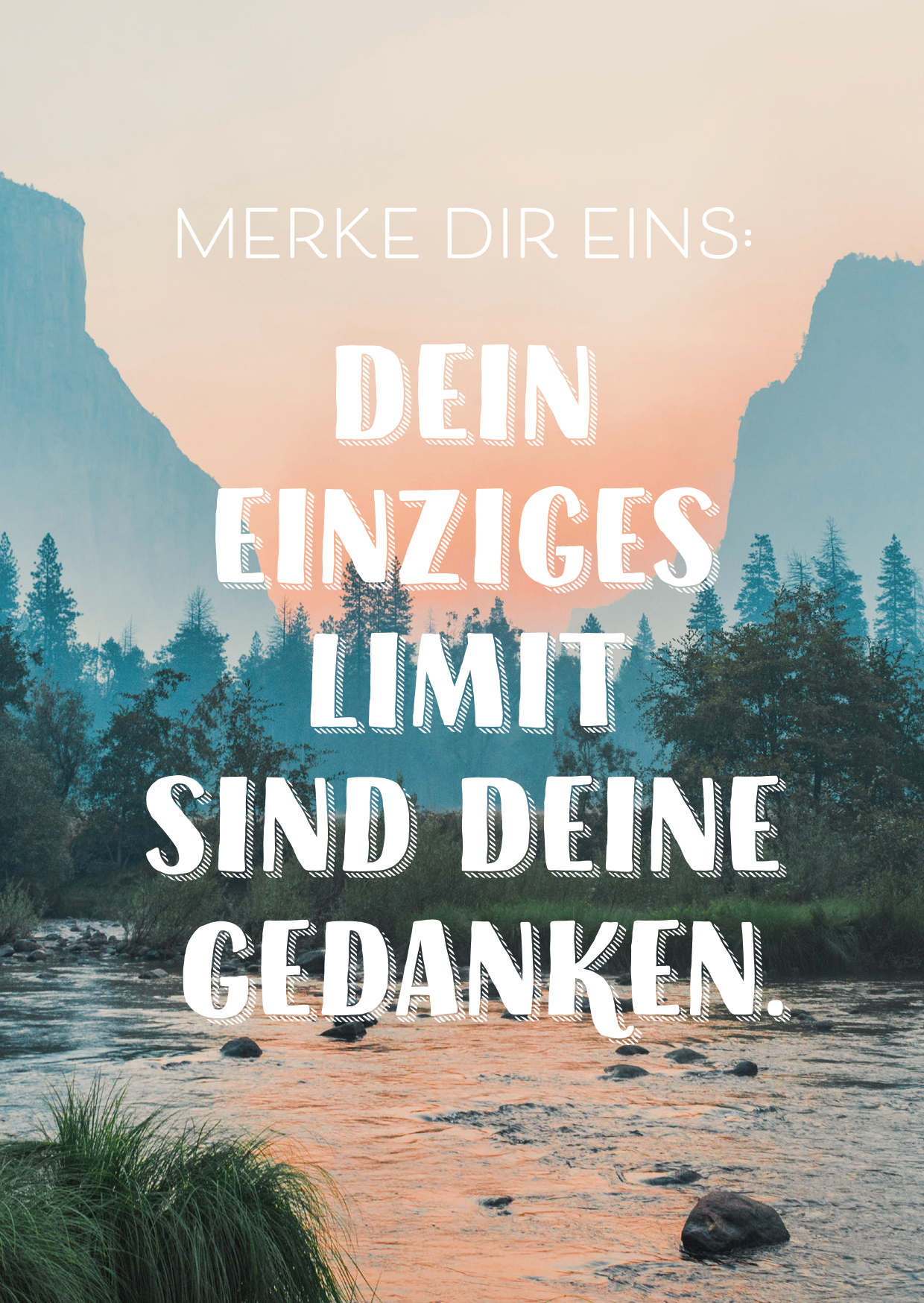 Eine atemberaubende Berglandschaft bei Sonnenaufgang zeigt einen klaren Fluss und Bäume. Ein motivierendes Zitat erinnert daran, dass Gedanken die einzigen Grenzen setzen.