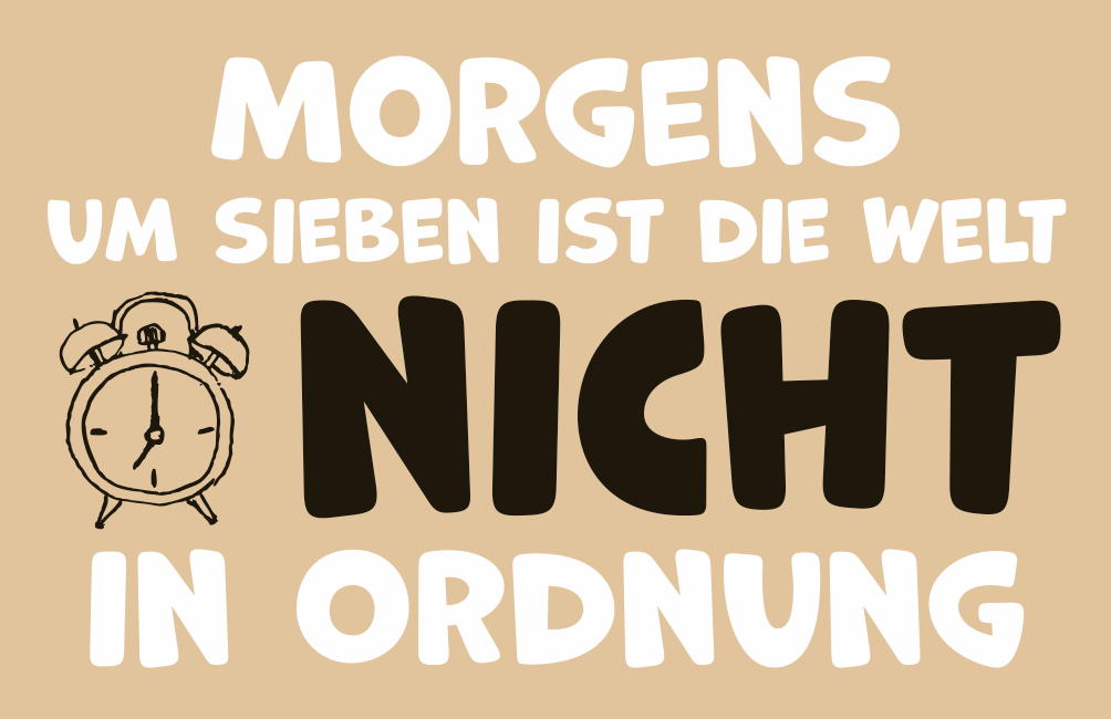 Der Spruch beschreibt humorvoll, wie herausfordernd das frühe Aufstehen um sieben Uhr morgens sein kann, wenn alles unordentlich erscheint.