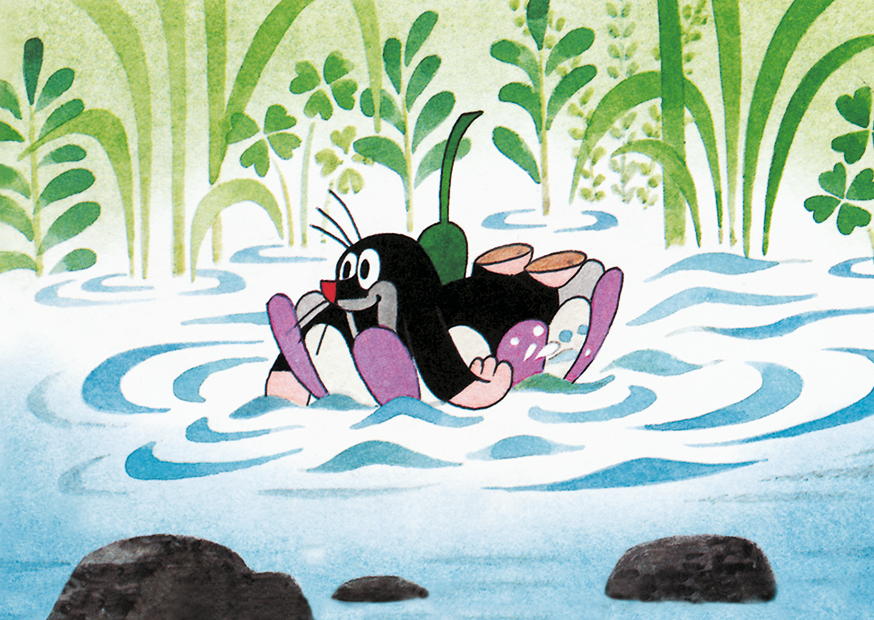 Der Maulwurf genießt ein erfrischendes Bad im Wasser, umgeben von üppigen Pflanzen und glitzernden Wellen an einem sonnigen Tag.