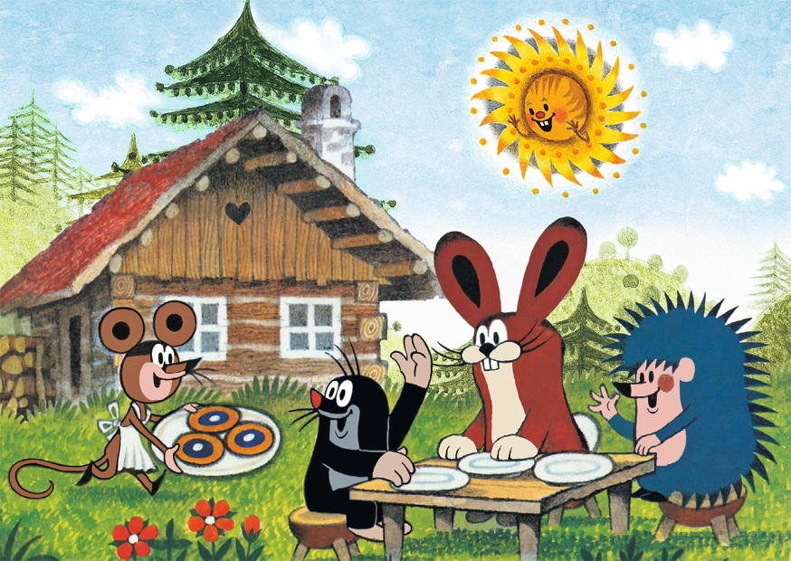 In der malerischen Natur genießen ein Maulwurf, ein Hase, ein Igel und eine Maus ein Picknick vor einem charmanten Holzhaus. Die Sonne scheint warm.