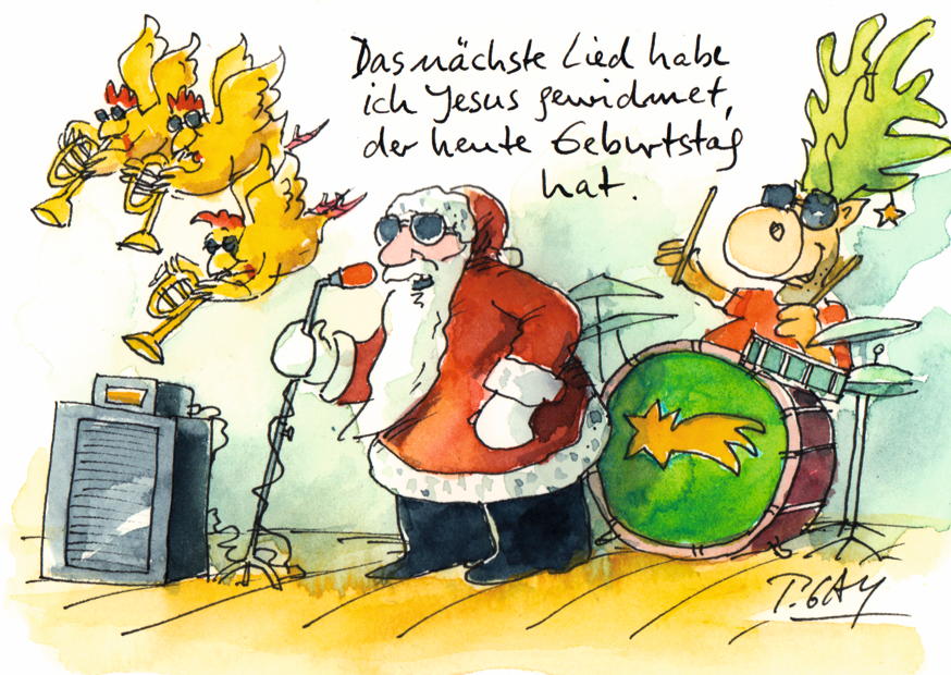 Ein bunter Weihnachtsmann steht am Mikrofon und singt, während Tiere mit Blasinstrumenten und einer Trommel für festliche Stimmung sorgen. Es ist eine fröhliche Weihnachtsfeier.