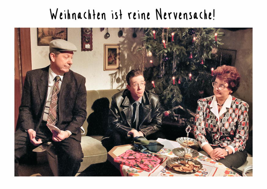 Drei Personen sitzen um einen Tisch in einem festlich geschmückten Wohnzimmer. Sie sind in weihnachtlicher Stimmung, umgeben von Kerzen und Dekoration.