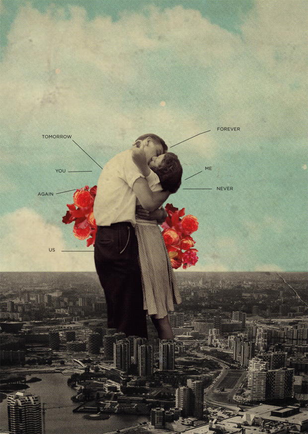 Ein verliebtes Paar umarmt sich innig, während im Hintergrund eine moderne Stadtlandschaft zu sehen ist, die von blühenden Blumen umrahmt wird.