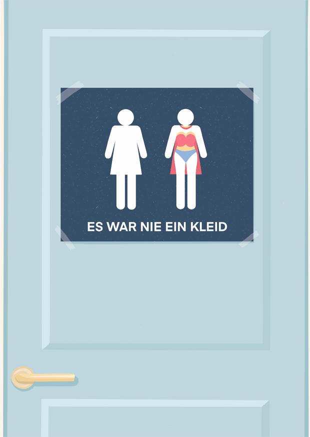 An der Tür eines modernen Badezimmers hängt ein Schild, das Geschlechteridentität anspricht und einen kritischen Blick auf traditionelle Rollen wirft.