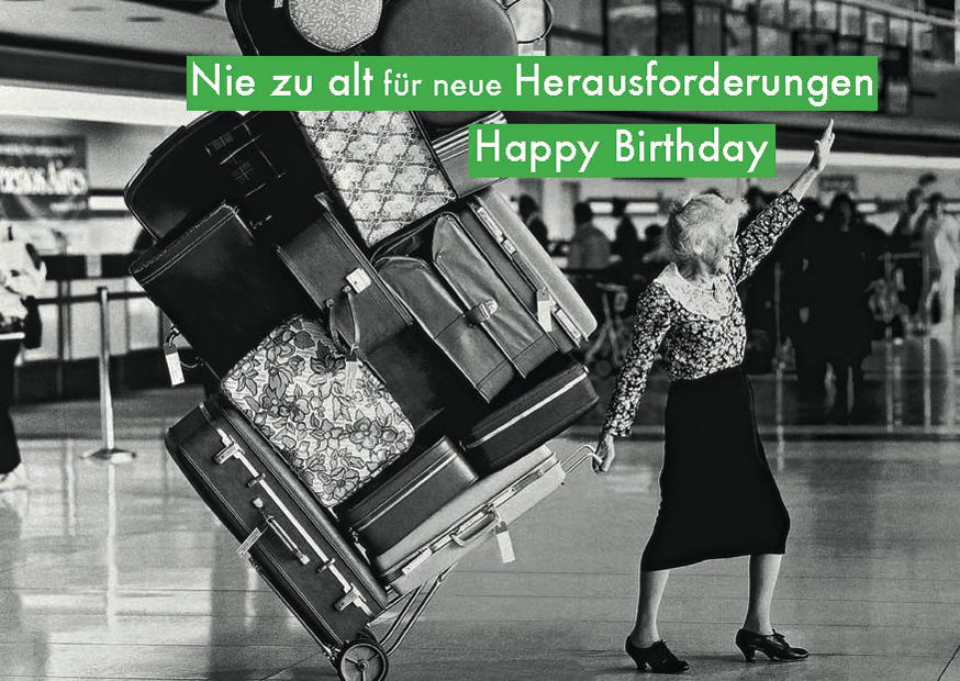 Eine ältere Frau steht am Flughafen und winkt lächelnd, während sie einen voll beladenen Gepäckwagen mit farbenfrohen Koffern und Taschen schiebt. Es ist ihr Geburtstag.