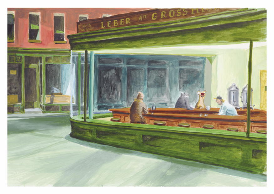 In einem gemütlichen Restaurant sitzen mehrere Gäste an der Theke und unterhalten sich, während das Licht den Raum in eine angenehme Atmosphäre taucht. Draußen sind leere Straßen.