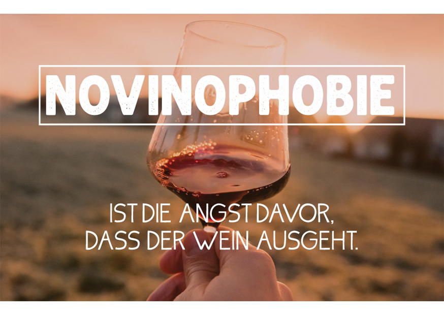 Eine Hand hält ein Weinglas mit rotem Wein im Freien. Der Abendhimmel zeigt warme Farben und subtilen Sonnenuntergang, während der Begriff Novinophobie hervorgehoben wird.