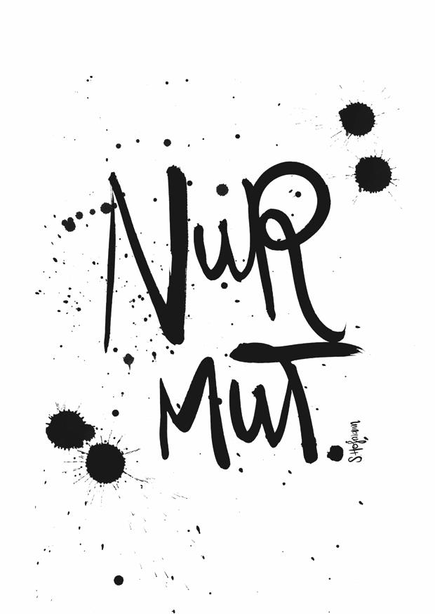 Eine inspirierende Handlettering-Arbeit zeigt den Spruch Nur Mut in künstlerischer Schriftart, umgeben von schwarzen Farbklecksen auf weißem Hintergrund.