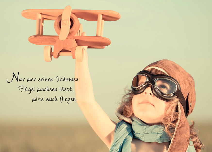 Ein Kind hält ein Holzflugzeug hoch, während es mit einem fröhlichen Lächeln in den Himmel blickt. Der sonnige Tag und die fantasievolle Stimmung sind spürbar.