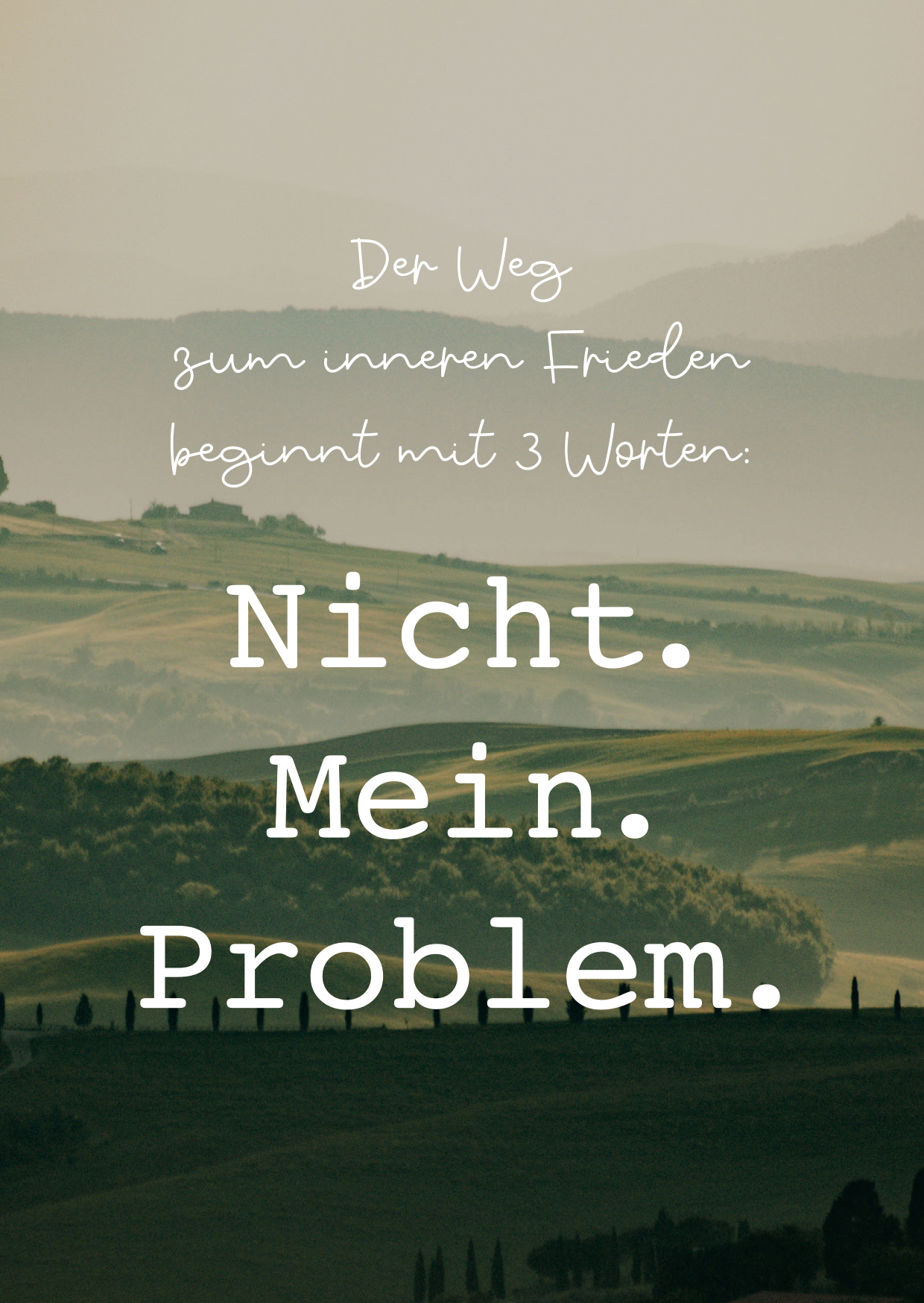 Die Ansicht zeigt eine malerische Landschaft mit sanften Hügeln und einer ruhigen Atmosphäre. Drei prägnante Worte regen zum Nachdenken an und fördern die innere Reflexion.