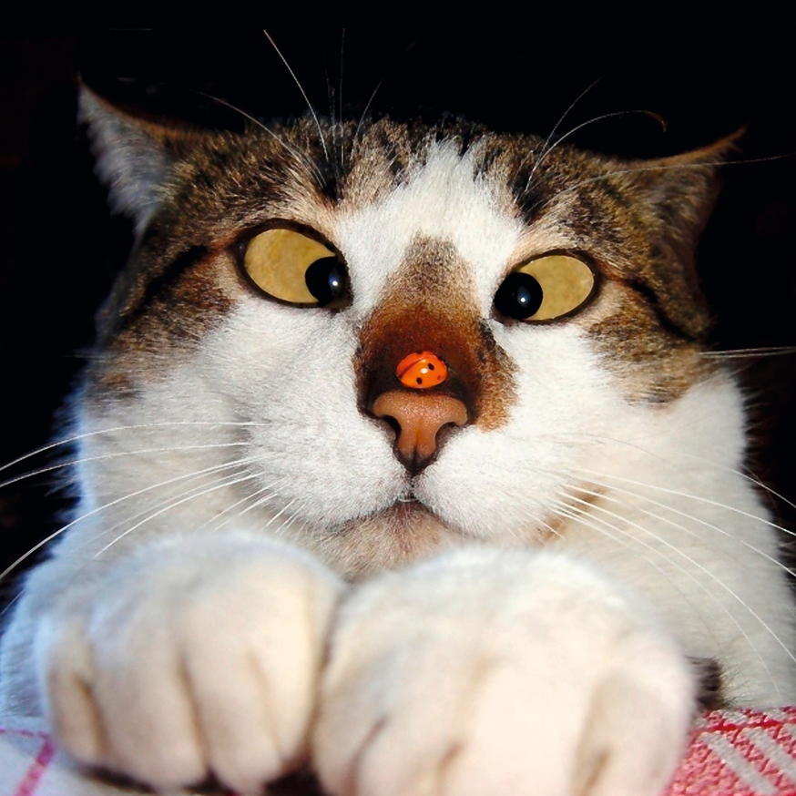 Eine Katze mit großen, wachen Augen steht überrascht da, während ein Marienkäfer auf ihrer Nase sitzt. Die Szene vermittelt ein Gefühl von Neugier und Staunen.