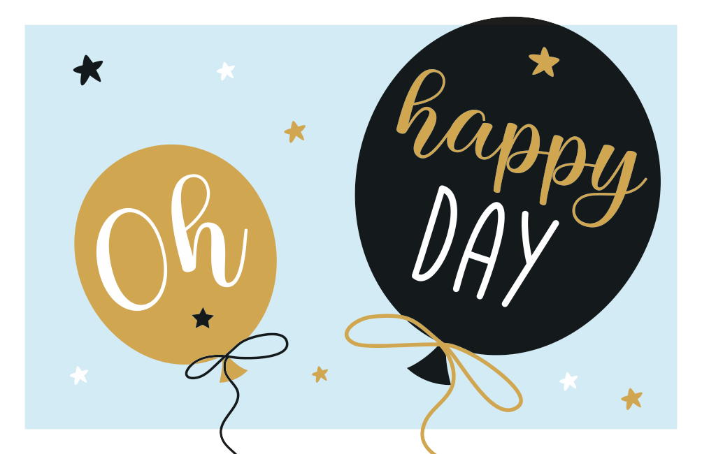 Zwei dekorative Luftballons in Gold und Schwarz schweben am Himmel und tragen den Schriftzug Oh happy Day, ideal für eine fröhliche Veranstaltung oder einen besonderen Anlass.