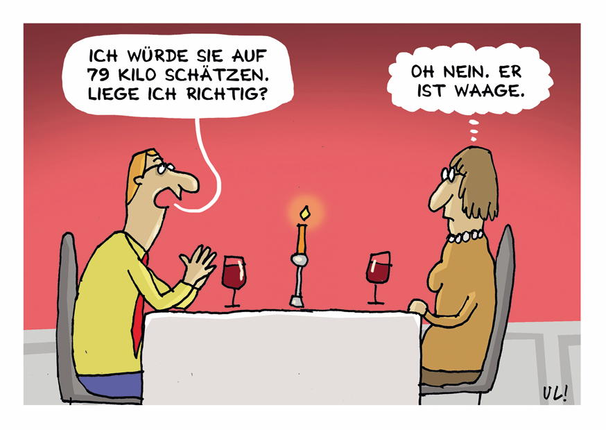 Ein Paar sitzt am Tisch bei Kerzenschein und diskutiert humorvoll über Gewichtsschätzungen, während Rotweingläser auf dem Tisch stehen.