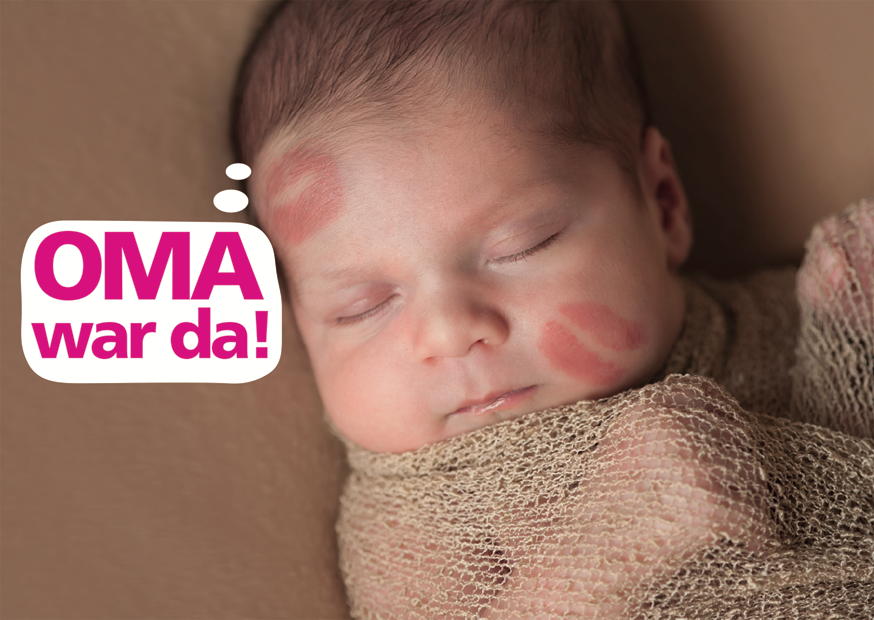 Ein neugeborenes Baby schläft friedlich mit liebevollen Lippenstiftabdrücken auf der Wange. Diese zärtlichen Spuren deuten auf einen süßen Besuch der Großmutter hin, die ihre Zuneigung zeigte.