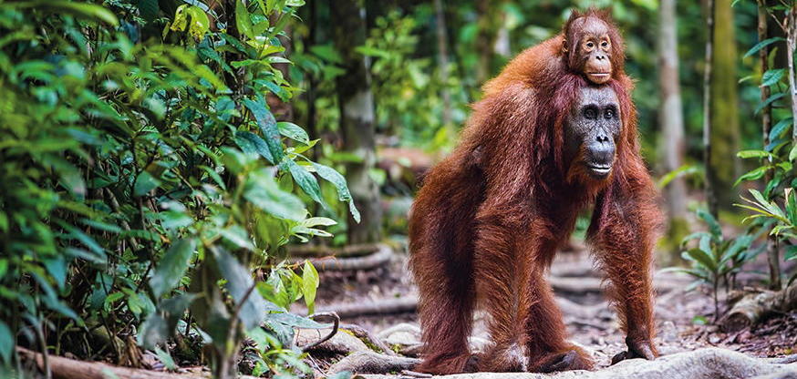 Eine Orang-Utan-Mutter begleitet ihr Jungtier, während sie durch den dichten Dschungel von Borneo streifen. Die Tiere bewegen sich auf dem Boden zwischen den Pflanzen.