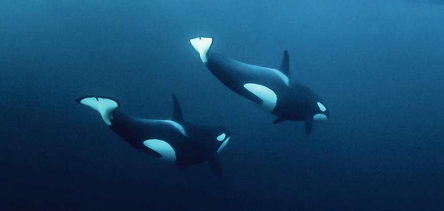 In den tiefen, blauen Gewässern des Ozeans schwimmen zwei Schwertwale ruhig und majestätisch. Ihre markanten schwarz-weißen Farben stechen hervor, während sie die Umgebung erkunden.