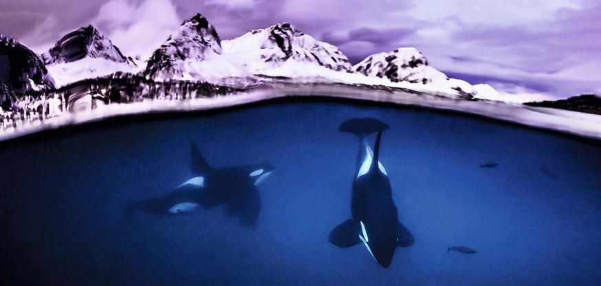 Zwei Orcas gleiten majestätisch unter der Wasseroberfläche, während die schneebedeckten Berge im Hintergrund die winterliche Szenerie ergänzen. Die Dämmerung verleiht der Umgebung mystische Farben.