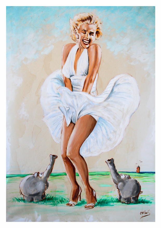 Eine fröhliche Frau in einem schwingenden weißen Kleid tanzt vergnügt im Freien, während sie von zwei neugierigen Elefanten beobachtet wird. Das Wetter ist sonnig und heiter.