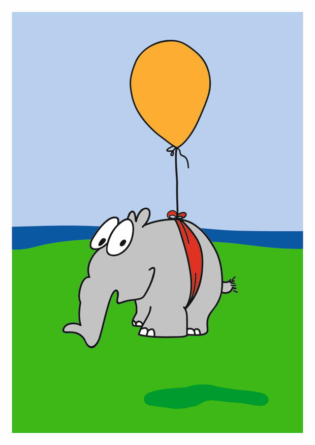 Ein grauer Elefant steht fröhlich auf einer grünen Wiese. Er trägt einen roten Gurt und hält einen orangefarbenen Ballon, während der blaue Himmel über dem Meer zu sehen ist.