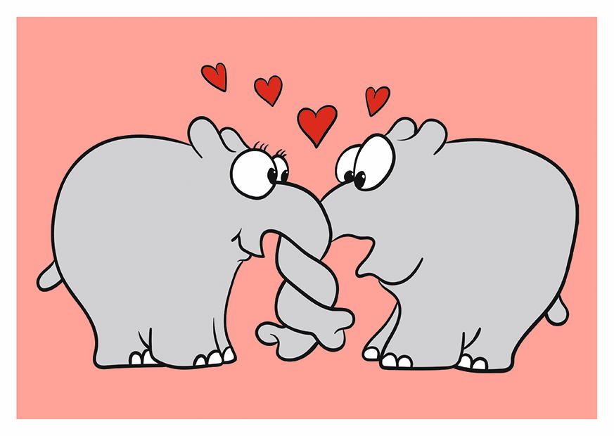 Zwei Elefanten stehen einander gegenüber und zeigen einen liebevollen Moment, während sie sich mit einer verspielten Geste umschlingen. Herzchen umgeben sie.