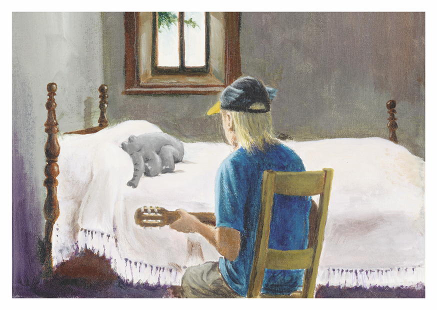 In einem Raum mit Fenster spielt ein Junge mit blonden Haaren und einer Mütze auf einem Stuhl eine Melodie auf seiner Gitarre, während sein Stofftier zuhört.