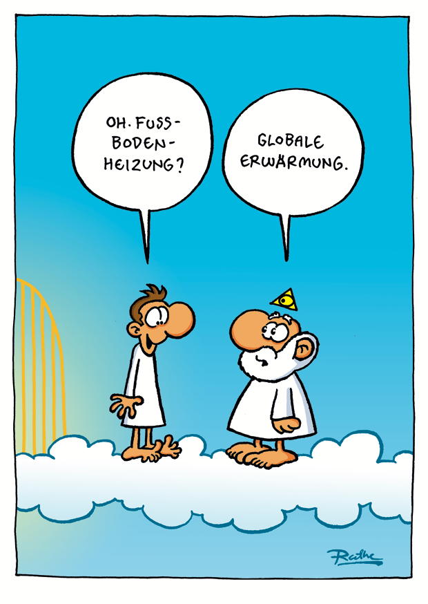 Auf einer Wolke sprechen zwei Männer, einer in einem weißen Gewand und ein anderer in einem modernen Outfit, über die Themen Fußbodenheizung und globale Erwärmung.