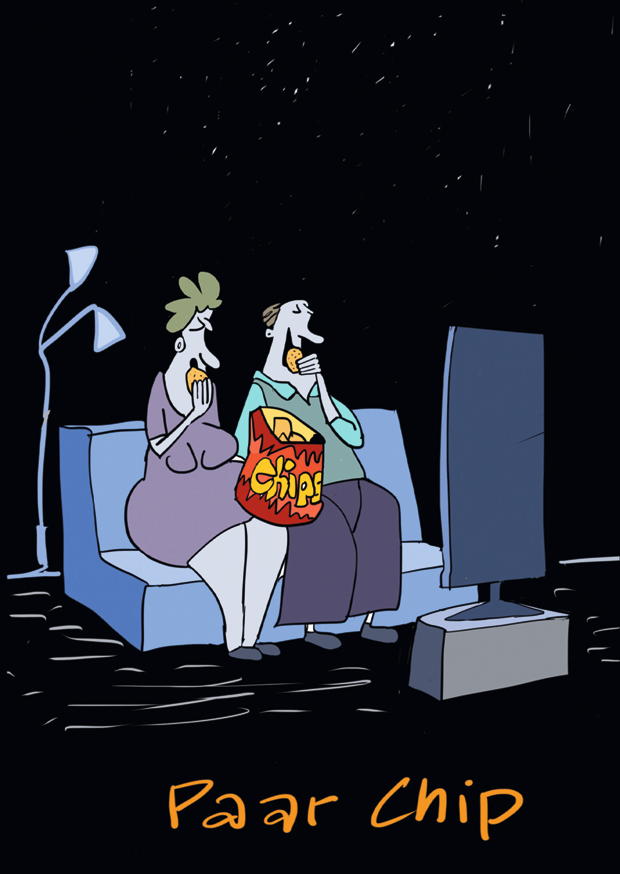Zwei Menschen sitzen gemeinsam auf einem Sofa und schauen gespannt fern. Sie essen Chips und genießen den Ruhestand am Abend.