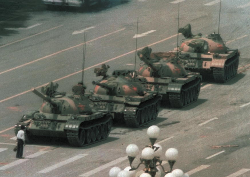 Drei Panzer fahren in einer Reihe über eine breite Straße in Peking, während umstehende Menschen die Situation beobachten. Der Kontext deutet auf eine kritische Zeitperiode hin.