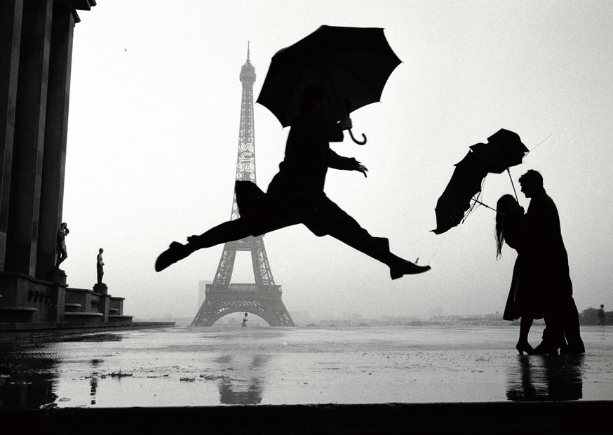 Menschen in Paris stehen unter Regenschirmen und genießen den Regen. Im Hintergrund ist der Eiffelturm sichtbar, während eine Person freudig springt.