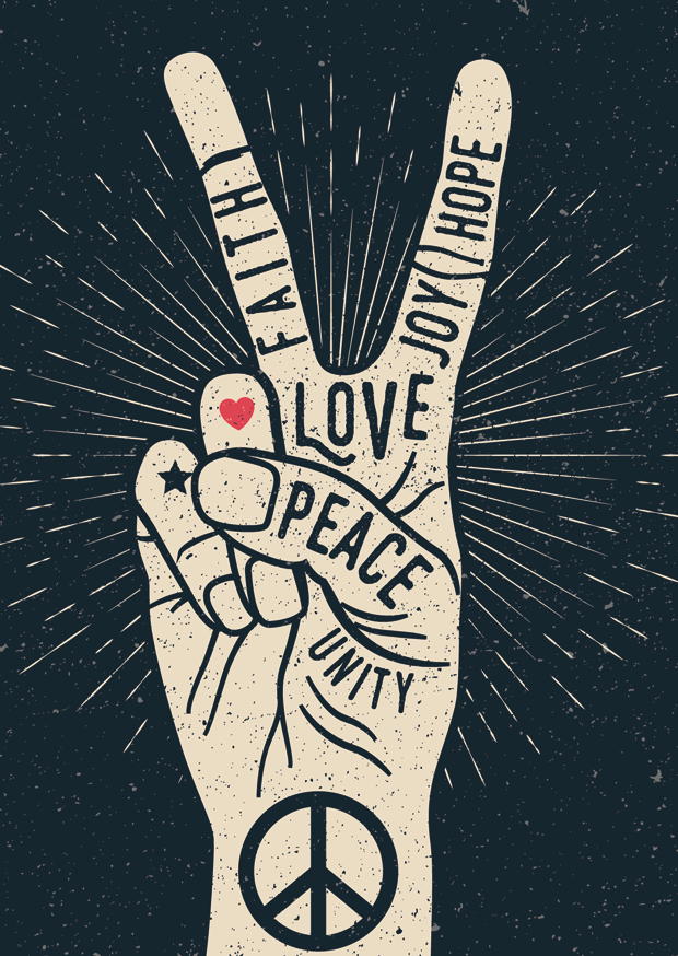 Eine Hand zeigt das Frieden-Zeichen und trägt Symbole für Liebe, Hoffnung und Freude, was eine starke Botschaft der Einheit und des Glaubens vermittelt.