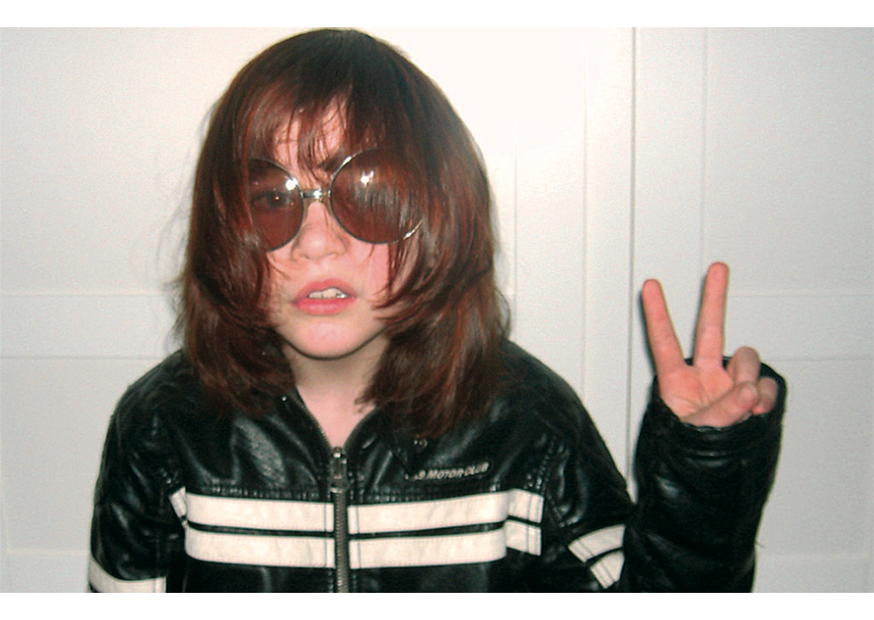 In einem hellen Innenraum steht ein Jugendlicher mit langen, braunen Haaren und Sonnenbrillen. Er posiert entspannt und zeigt das Peace-Zeichen mit der Hand, was eine positive Stimmung ausstrahlt.