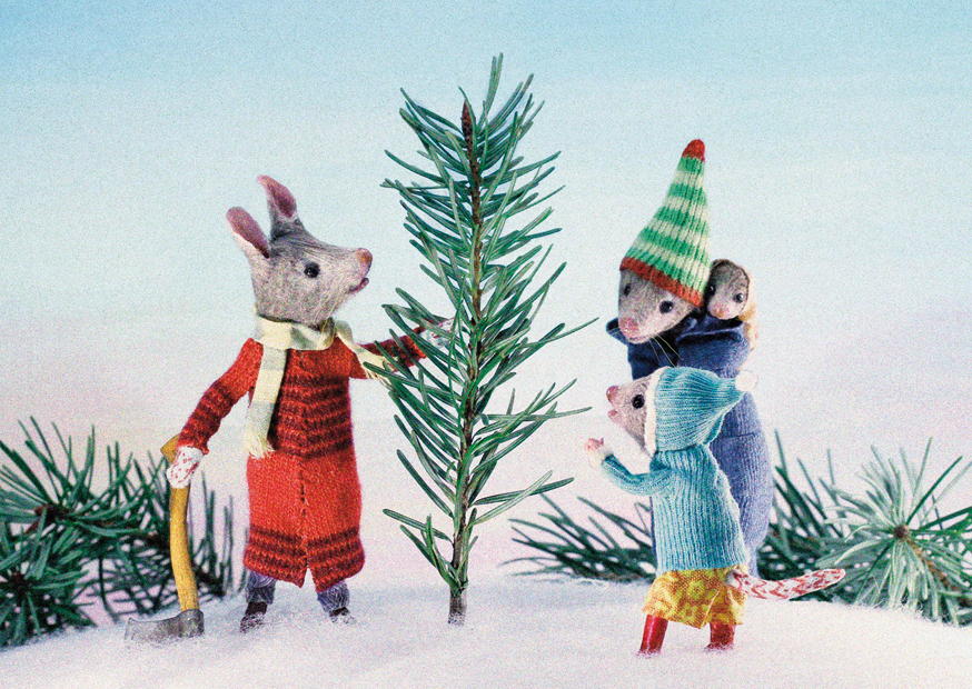 Die Mäusefamilie feiert den Winter, indem sie fröhlich einen kleinen Baum schmückt. Die Umgebung ist mit Schnee bedeckt und die Mäuse tragen bunte Kleidung.