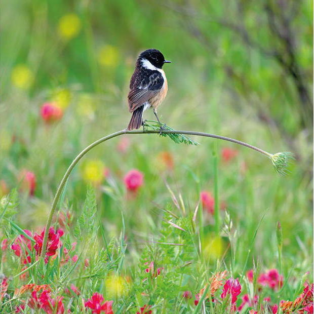 Ein kleiner Vogel mit auffälligem Gefieder steht auf einem Grasbüschel inmitten eines bunten Blumenfeldes in der Frühlingssonne.
