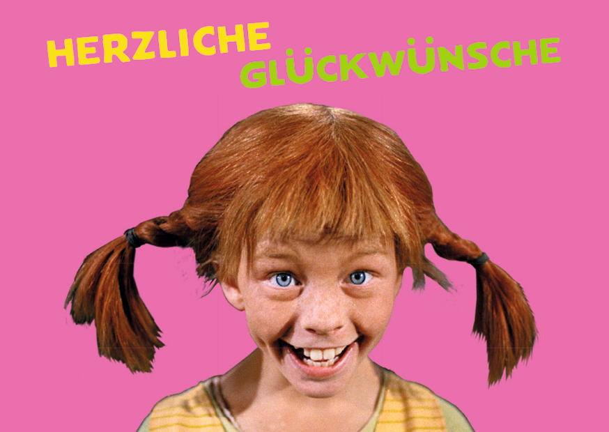 Ein aufgeregtes Kind mit roten Haaren und Zöpfen, Pippi Langstrumpf strahlt Freude aus und scheint eine Feier zu genießen. Der lebendige Hintergrund verstärkt die Fröhlichkeit des Moments.