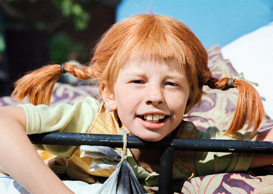 Ein Kind mit leuchtend roten Haaren und Zöpfen, Pippi Langstrumpf genießt die warme Sommersonne und spielt fröhlich auf einem Bett voller Kissen und Decken. Es zeigt ein strahlendes Lächeln.